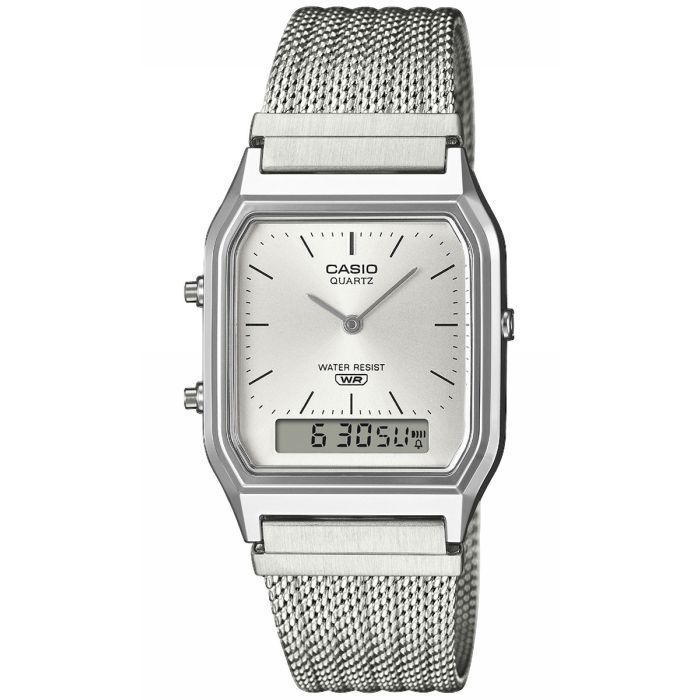 CASIO VINTAGE AQ-230EM-7AEF to unisexowy zegarek łączący klasyczny analogowo-cyfrowy design z lekką, stylową konstrukcją. Srebrna kolorystyka koperty, tarczy i bransolety nadaje mu ponadczasowy charakter, idealny zarówno dla kobiet, jak i mężczyzn. Ten model to hołd dla stylu retro w nowoczesnym wydaniu – funkcjonalny, uniwersalny i zawsze na czasie.