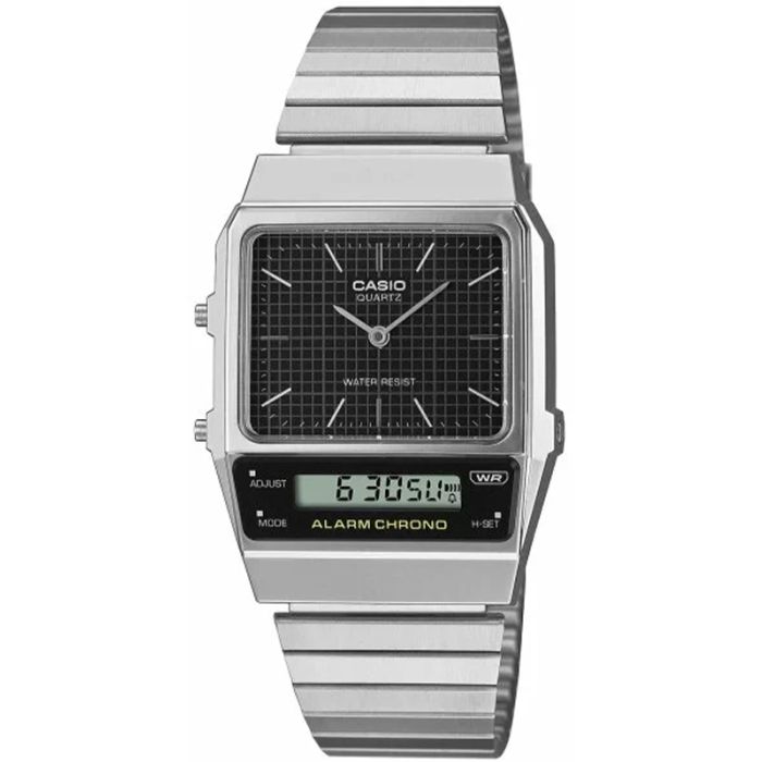 Reaktywuj swój styl. Casio Vintage AQ-800E-1AEF to niezwykle ciekawe nowe wydanie modelu Casio AQ-450 z lat 80. Jego charakterystyczną cechą jest klasyczna tarcza analogowa połączona z wyświetlaczem LCD. Tarcza analogowa została ozdobiona wzorem w kratkę, co dodaje zegarkowi charakteru retro. Połączenie kanciastej obudowy i prostych ogniw metalowego paska to prosta i stylowa celebracja strukturalnego piękna.