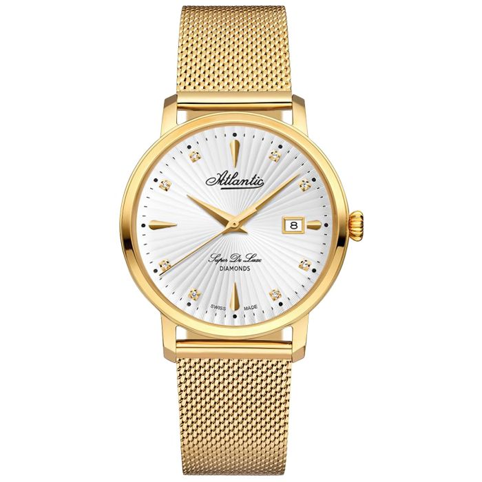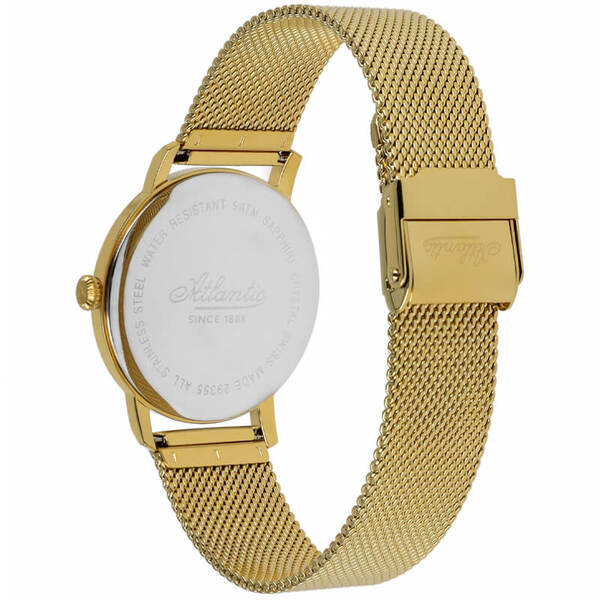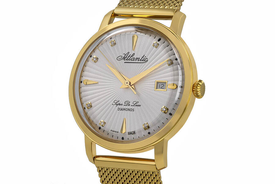 Koperta modelu Atlantic Super De Luxe 29355.45.27 została wykonana ze stali szlachetnej pokrytej powłoką w złotym kolorze. Polerowanie i kolor powłoki nadają zegarkowi subtelny blask, który z pewnością zwróci uwagę obserwujących. Koperta zapewnia bezpieczeństwo mechanizmu zamkniętego w jej wnętrzu, a klasyczna sylwetka stanowi o eleganckim charakterze zegarka. Mimo tradycyjnego kształtu zachowuje ona współczesnego ducha dzięki lekkiej linii. Pewnym przełamaniem jest tu koronka z delikatnym żłobieniem. Z kolei wprawione w kopertę wypukłe szkło szafirowe odporne na zarysowania chroni tarczę i wskazówki, ja też podnosi ekskluzywność zegarka. Szafir ustępuje pod względem twardości jedynie diamentowi, więc jest bardzo cenionym materiałem lunet zegarkowych.