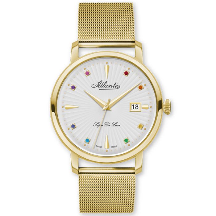 Damski zegarek Atlantic Super De Luxe Precious Stones 29355.45.29MB to idealna propozycja dla kobiet ceniących subtelny luksus i elegancję. Wyjątkowa tarcza z barwionymi szafirami, szafirowe szkło oraz złota koperta tworzą niepowtarzalny wygląd tego czasomierza. Gęsto pleciona bransoleta typu mesh / mediolańska doskonale współgra z całością, nadając zegarkowi wyjątkowy charakter. Mechanizm kwarcowy Ronda 705 gwarantuje niezawodność i precyzyjne wskazanie czasu. Atlantic Super De Luxe Precious Stones 29355.45.29MB to zegarek dla kobiet, które pragną dodać odrobinę luksusu do swojej codzienności.