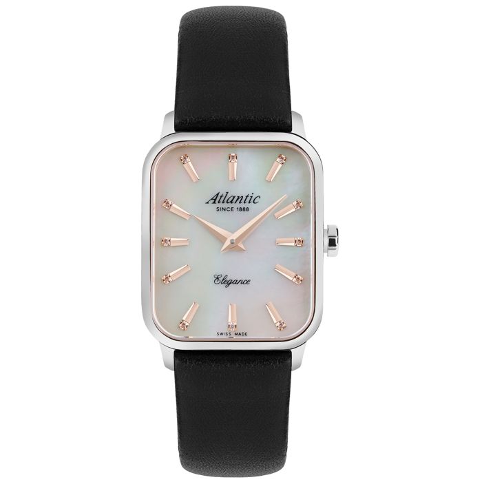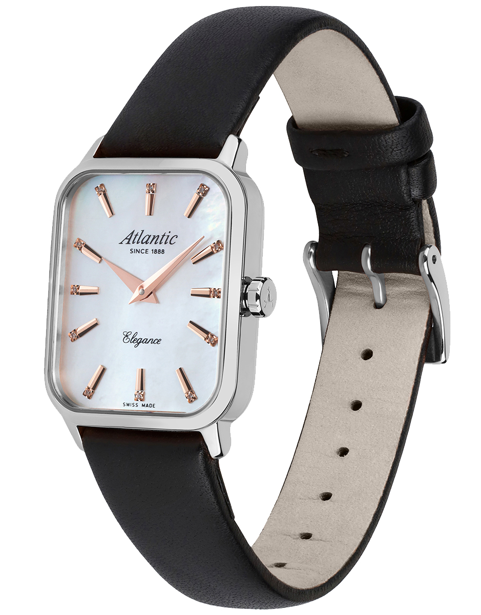 Koperta zegarka Atlantic została wykonana z wysokiej jakości stali szlachetnej o średnicy 25 mm – idealnie dopasowuje się do smukłych kobiecych nadgarstków. Jej srebrny kolor nadaje całości świeżości i klasy. Uzupełnieniem całości jest naturalny skórzany pasek w kolorze czarnym, o szerokości 16 mm przy kopercie. Pasek jest nie tylko stylowy, ale również miękki i wygodny w noszeniu.