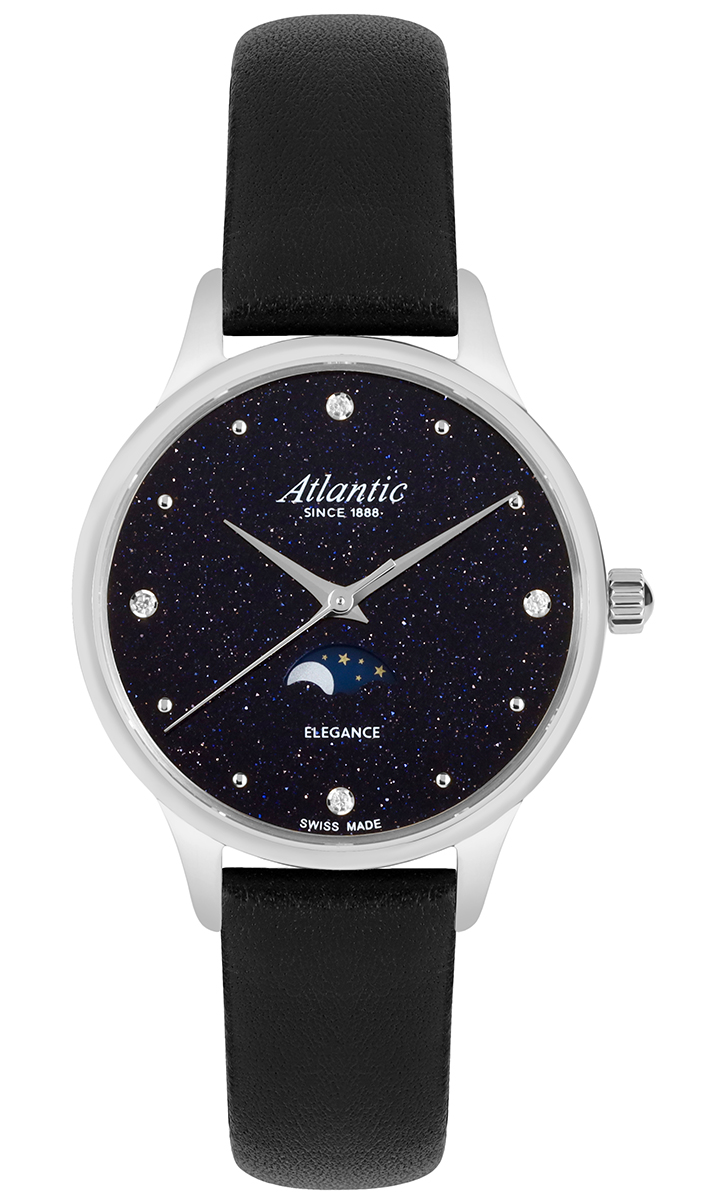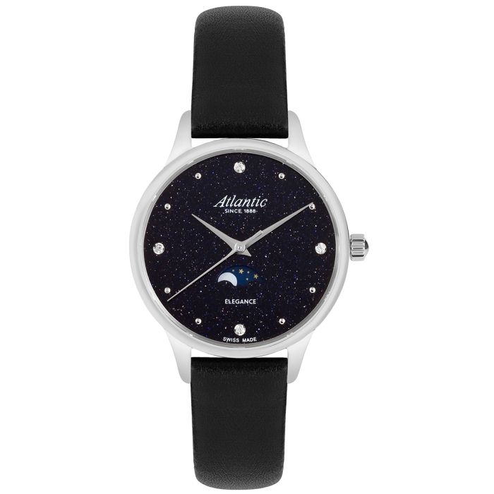 Atlantic Elegance Moonphase Aventurine 30230.41.59L to wyjątkowy zegarek damski, który zachwyca połączeniem klasyki, subtelnego luksusu i szwajcarskiej precyzji. Należący do kolekcji Elegance Aventurine, stanowi wyraz ponadczasowego stylu i kobiecego wdzięku. Srebrna koperta zestawiona z czarnym skórzanym paskiem tworzy eleganckie, uniwersalne połączenie, idealne zarówno do codziennych, jak i wieczorowych stylizacji.