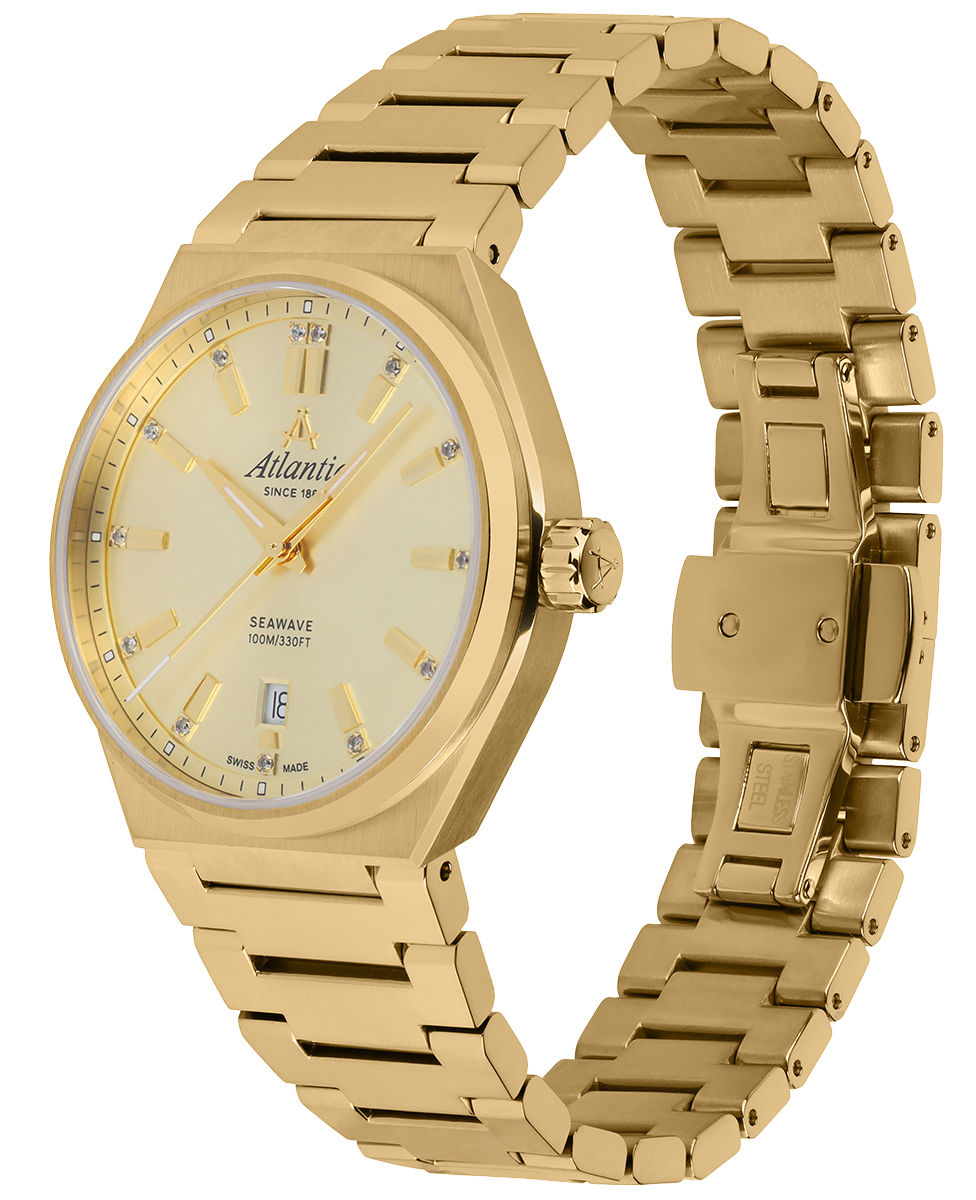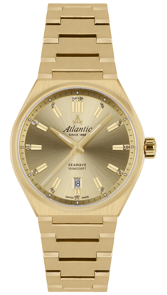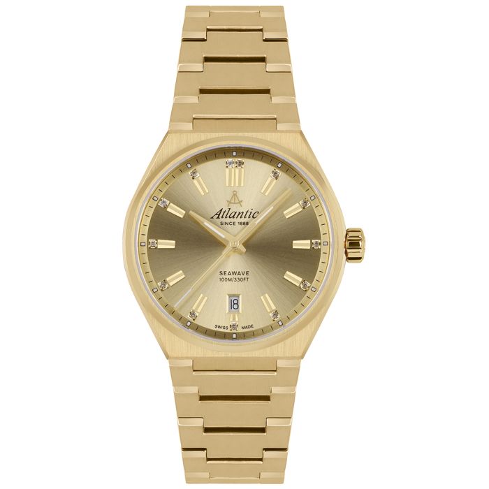 ATLANTIC Seawave Lady 39365.45.31 to zegarek damski klasy premium, który łączy w sobie złotą elegancję i szwajcarską precyzję. To propozycja dla kobiet, które cenią luksusowe dodatki w nowoczesnym wydaniu. Zastosowanie szafirowego szkła, stalowej bransolety w złotym odcieniu oraz wodoszczelności do 100 m czyni z tego modelu niezawodnego towarzysza na co dzień i od święta.