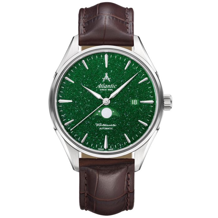 Centralnym elementem zegarka jest analogowa tarcza w kolorze głębokiej zieleni, która przyciąga wzrok i podkreśla luksusowy charakter czasomierza. Zastosowana komplikacja faz księżyca (moonphase) świadczy o wysokim poziomie zegarmistrzowskiego rzemiosła marki Atlantic. Zegarek posiada również datownik, zwiększający funkcjonalność w codziennym użytkowaniu.
