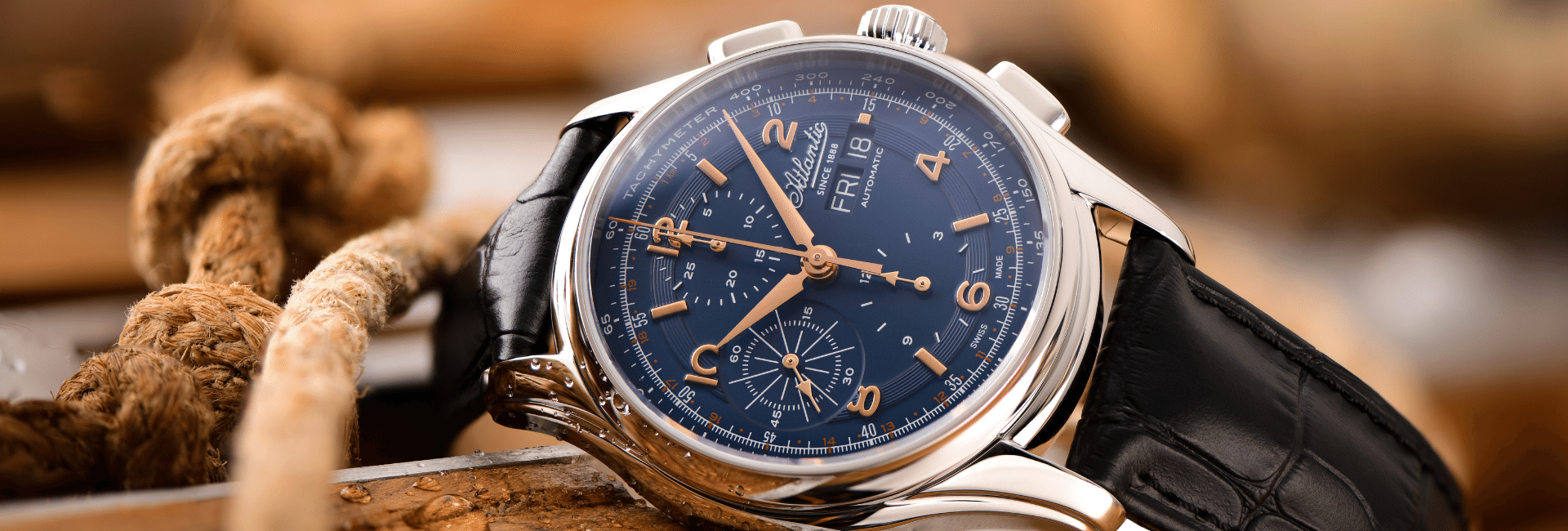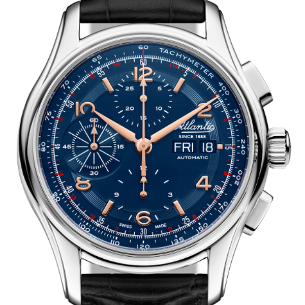Tarcza zegarka Atlantic 52852.41.55R prezentuje bogactwo jego estetykę i bogactwo funkcji. Wskazówki i indeksy godzinowe w kolorze różowego złota kontrastują z niebieskim tłem i tworzą eleganckie połączenie. Na tarczy dostrzeżemy również delikatny, giloszowany pierścień przebiegający przez indeksy. Na godzinach szóstej, dziewiątej i dwunastej umieszczono subtarcze chronografu, a na godzinie trzeciej znajdziemy okienka datownika. Tarczę okala podziałka tachometru. Mnogość detali nie utrudnia jednak odczytu czasu, co jest zdecydowanym atutem tego zegarka.