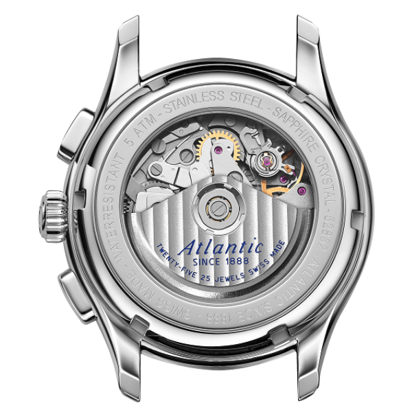 "Sercem" zegarka Atlantic 52852.41.55R jest mechanizm automatyczny ETA Valjoux 7750. Ten ceniony kaliber posiada 25 kamieni łożyskujących i rezerwę chodu wynoszącą około 48 godzin. Mechanizm ETA Valjoux 7750 dysponuje także komplikacją chronografu — w dużym uproszczeniu działa on jak stoper, pozwalając na precyzyjny pomiar czasu do pół godziny. Na tarczy zegarka widać subtarcze chronografu, pokazujące minuty, sekundy i dziesiąte części sekund. Dzięki chronografowi model Atlantic 52852.41.55R przypadnie do gustu w szczególności miłośnikom sportów, w których liczą się sekundy. Zegarek sprzedawany jest w komplecie z pudełkiem wyposażonym w rotomat, czyli urządzenie, które nakręca mechanizm, gdy zegarek jest odłożony od pudełka.