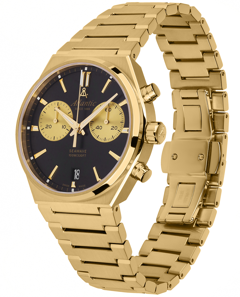 Atlantic Seawave Chrono 58466.45.61 to męski zegarek stworzony z myślą o nowoczesnych mężczyznach, którzy cenią elegancję w sportowym wydaniu. Model z kolekcji Seawave Chronograph łączy w sobie dynamiczny design, funkcjonalność i precyzyjną szwajcarską technologię. Jego złota stalowa koperta i dopasowana złota bransoleta nadają mu prestiżowy, luksusowy wygląd, który doskonale sprawdzi się zarówno w codziennym, jak i bardziej formalnym stylu.