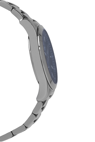 Tarcza tego zegarka jest niezwykle intrygująca dzięki efektowi szlifu słonecznego, który nadaje jej subtelny blask. Duże indeksy i wskazówki o spiczastych zakończeniach dodają mu męskiego charakteru, podkreślając pewność siebie noszącego go mężczyzny.