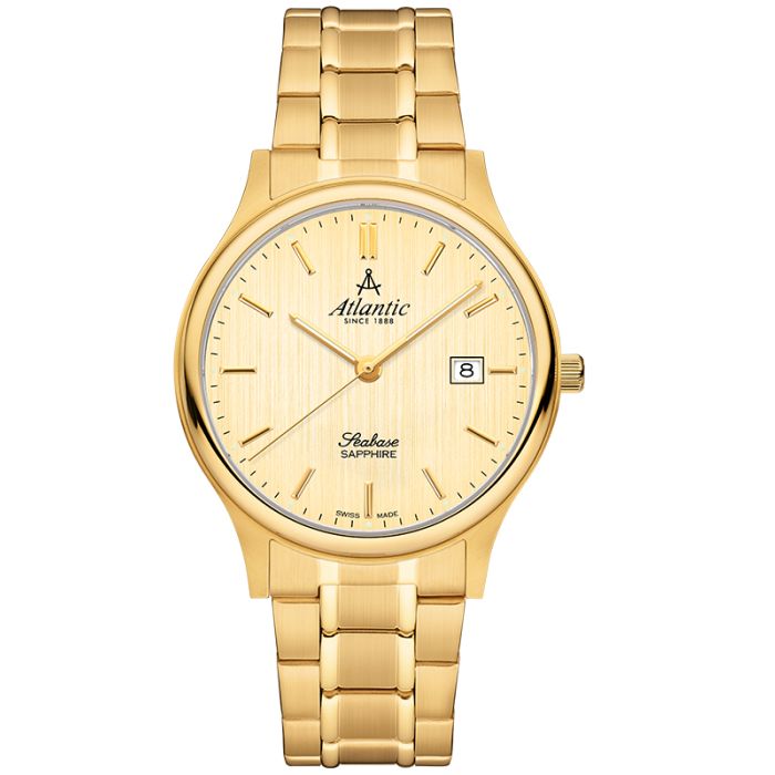 ATLANTIC Seabase 60348.45.31 to klasyczny zegarek męski z podstawowej kolekcji marki Atlantic skierowany do mężczyzn ceniących prostotę i elegancję. Estetyczne wykonanie podkreśla jakość i prestiż tego modelu. Koperta o średnicy 40 mm i grubości 8 mm oraz bransoleta zostały wykonane z wysokiej jakości stali nierdzewnej, dzięki czemu są odporne na korozje i uszkodzenia. Szkło szafirowe jest odporne na zarysowania, co zapewnia nam estetyczny wygląd szkła przez cały czas użytkowania. Całość została wykończona w złoceniu metodą PVD. Tarcza w jasnym kolorze jest bardzo stonowana i czytelna. Wodoszczelność tego modelu jest bezpieczna dla zachlapań i mycia rąk. Dodatkowo na tarczy zamieszczono datownik z dniem miesiąca.
