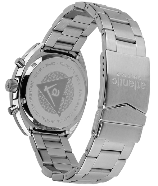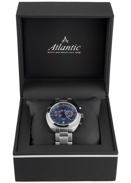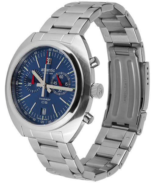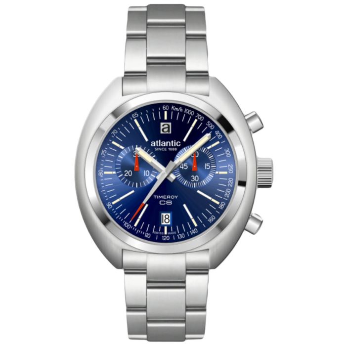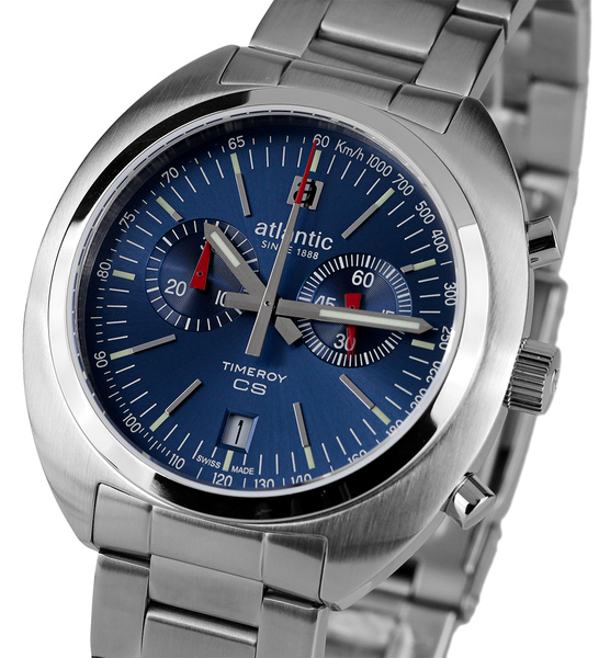 Zegarek Atlantic Timeroy CS Chrono posiada niezwykle kontrastową tarczę w kolorze niebieskim, którą przykrywa wytrzymałe szkło szafirowe. Szkło to jest nie tylko niezwykle twarde, ale także odporne na zarysowania, zapewniając długotrwałą przejrzystość. Na tarczy znajdują się dodatkowe subtarcze, które świadczą o obecności funkcji chronografu, pozwalającego na dokładny pomiar odstępów czasu. Logo marki zastosowane na tarczy to wersja z lat 70-tych, a wskazówka sekundnika ma kształt wydłużonego trójkąta, nawiązując do symboli marki Atlantic.