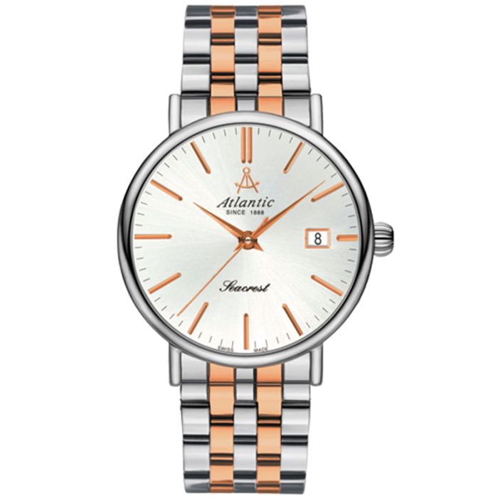 Atlantic Seacrest to klasyka sama w sobie. Prezentowany model doskonale prezentuje się na męskim nadgarstku dzięki idealnie wyważonym proporcjom. Estetyczne wykonanie podkreśla jakość i prestiż tego modelu. Został wykonany z wysokiej jakości stali nierdzewnej, dzięki czemu jest odporny na korozje i uszkodzenia. Szkło szafirowe jest odporne na zarysowania, co zapewnia nam estetyczny wygląd szkła przez cały czas użytkowania. Do tego modelu została założona stalowa bransoleta, która ma pozłacane elementy metodą PVD. Tarcza w tym modelu w kolorze srebrnym jest bardzo stonowana i przejrzysta. Wodoszczelność tego modelu jest bezpieczna dla powierzchownych czynności z wodą np. prysznic, ale nie do głębokiego zanurzania. Dodatkowo na tarczy zamieszczono datownik z dniem miesiąca.