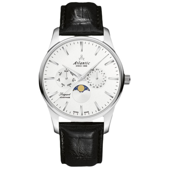 Zegarek męski ATLANTIC Seaport 56550.41.21 to wcielenie klasyki samej w sobie. Estetyczne wykonanie podkreśla doskonała jakość wykonania oraz idealnie wyważone proporcje prosto ze Szwajcarii. Kopertę o średnicy 41 mm wykonano z wysokiej jakości stali nierdzewnej, dzięki czemu jest odporna na korozje i uszkodzenia. Natomiast czarny pasek został uszyty z naturalnej skóry, która wygodnie układa się na nadgarstku. Zastosowane szkło szafirowe jest odporne na zarysowania, co zapewnia nam estetyczny wygląd zegarka przez cały czas użytkowania. Na czytelnej, białej tarczy znajdują się wskazania dni tygodnia, miesiąca oraz wskaźnik faz księżyca. Wysokiej klasy szwajcarski mechanizm kwarcowy dokładnie wskazuje czas. Wodoszczelność tego modelu jest bezpieczna dla powierzchownych czynności z wodą np. prysznic, ale nie do głębokiego zanurzania.
