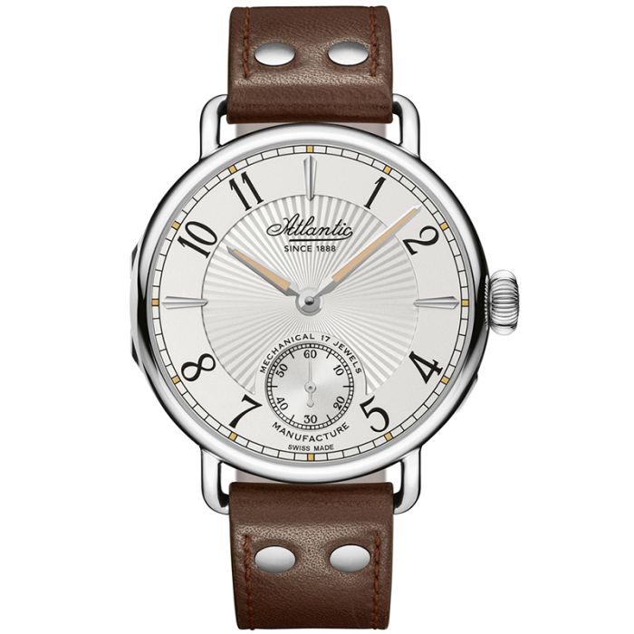Atlantic Worldmaster 57950.41.25 to wyjątkowy model powstały specjalnie na 130-lecie marki, który został wyprodukowany w limitowanej edycji jedynie 188 szt.! Klasyczny wygląd nawiązuje do pierwszych zegarków tego producenta. Duża, okrągła koperta wykonana ze stali szlachetnej oraz brązowy, skórzany pasek to elementy najwyższej jakości. Na jasnej tarczy zostało umieszczone klasyczne logo Atlantic, sub tarcza sekundnika oraz duże i czytelne indeksy. Model ten posiada mechanizm mechaniczny, który będzie wymagał ręcznego nakręcania. Samo serce tego wyjątkowego czasomierza to wyrafinowane dzieło zegarmistrzowskie, które zostało wyeksponowane przez przeszklony dekiel zamykany dodatkowo klapką niczym w klasycznych zegarkach kieszonkowych. Zastosowano tutaj modyfikację mechanizmu Unitas 6498-1, która posiada 46-godzinną rezerwę chodu, a częstotliwość pracy wynosi 18000 wahnięć na godzinę. Zegarek zabezpiecza szafirowe szkło odporne na wszelkie zarysowania. Model ten charakteryzuje klasa wodoszczelności 50M.