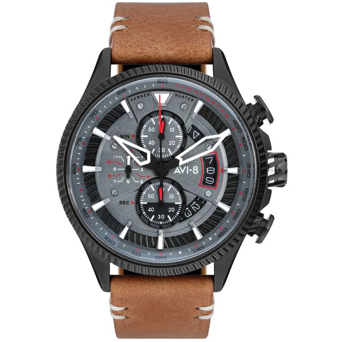 AVI-8 Hawker Hunter Avon Chronograph AV-4064-03 to model nawiązujący do legendarnego myśliwca odrzutowego Hawker Hunter F.1, który pobił światowy rekord prędkości lotu w 1953r. Nazwany został (Avon) na cześć tuboodrzutowego silnika Rolls Royce, który go napędzał. Chronograf ten jest pełen projektowych inspiracji zeczerpniętych bezpośrednio z tego samolotu. Wygląd i stylistyka tego modelu odwzorowano w brązowym, skórzanym pasku i szarej tarczy ze wskazówkami szkieletowymi. Serce tego czasomierza stanowi precyzyjny mechanizm kwarcowy, wyposażony stoper i datownik. Dodatkowo zegarek ten został wyposażony w wewnętrzny pierścień z podziałką tachometryczną. Szerokość koperty wynosi 44 mm. Klasa wodoszczelności na poziomie 50M oznacza, że może być używany podczas prysznica lub kąpieli. Okres gwarancji 2 lata.