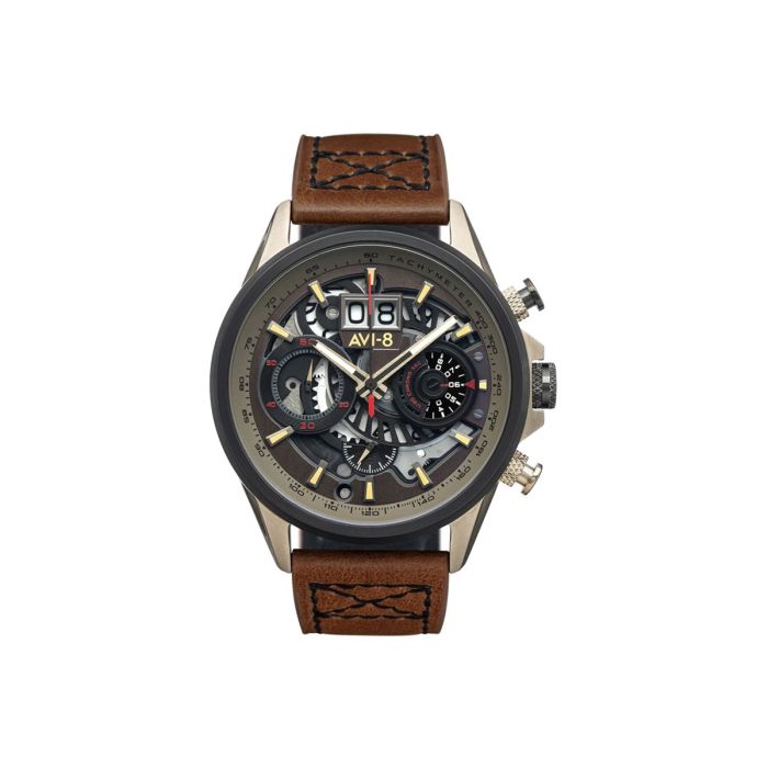 AVI-8 Hawker Harrier II Matador Chronograph AV-4065-06 to model nawiązujący do samolotów odrzutowych (znanych z możliwości pionowego startu i lądowania) latających w hiszpańskiej marynarcej wojennej. Wygląd i stylistyka zostały odwzorowane w brązowym, skórzanym pasku i tarczy ukazującej koła zębate jednostki napędowej zegarka. Serce tego czasomierza stanowi precyzyjny mechanizm kwarcowy, wyposażony stoper i duży czytelny datownik. Dodatkowo zegarek ten został wyposażony w wewnętrzny pierścień z podziałką tachometryczną. Klasa wodoszczelności na poziomie 50M oznacza, że może być używany podczas prysznica lub kąpieli. Okres gwarancji 2 lata.