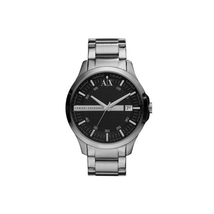 Modny zegarek męski Armani Exchange Hampton AX2103 ze sportowymi akcentami. Wyróżnia się dużą kopertą o średnicy 46 mm oraz bransoletą z pełnych ogniw. Kopertę wykonano z wysokiej jakości stali, która nie ulega procesowi korozji. Czarny cyferblat oznaczono wyraźnymi indeksami i wskazówkami w kolorze srebrnym. Ten model został wyposażony w mechanizm kwarcowy zasilany baterią z dodatkową funkcją datownika (wskazuje dzień miesiąca). Wodoszczelność 50M pozwala na ograniczony kontakt z wodą, np. prysznic lub kąpiel w wannie.