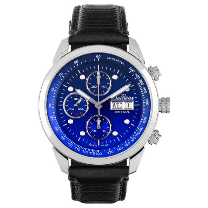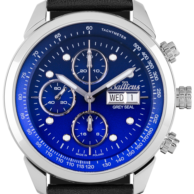 Tarcza modelu Balticus Grey Seal II Chronograph ujawnia bogactwo jego możliwości. Symboliczne indeksy godzinowe i wskazówki wzmocniono materiałem luminescencyjnym, dzięki czemu można odczytywać godzinę w ciemności. Na krawędzi tarczy widzimy skalę tachometru, umożliwiającego pomiar średniej prędkości obserwowanego obiektu na dystansie 1000 metrów. Na tarczy zauważymy także subtarcze chronografu. Okienka dnia tygodnia i datownika umieszczono na godzinie trzeciej.