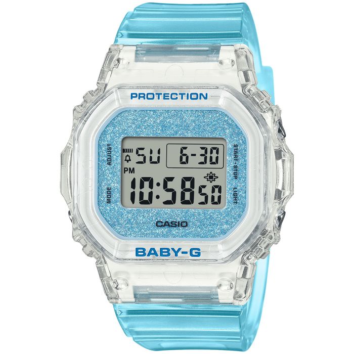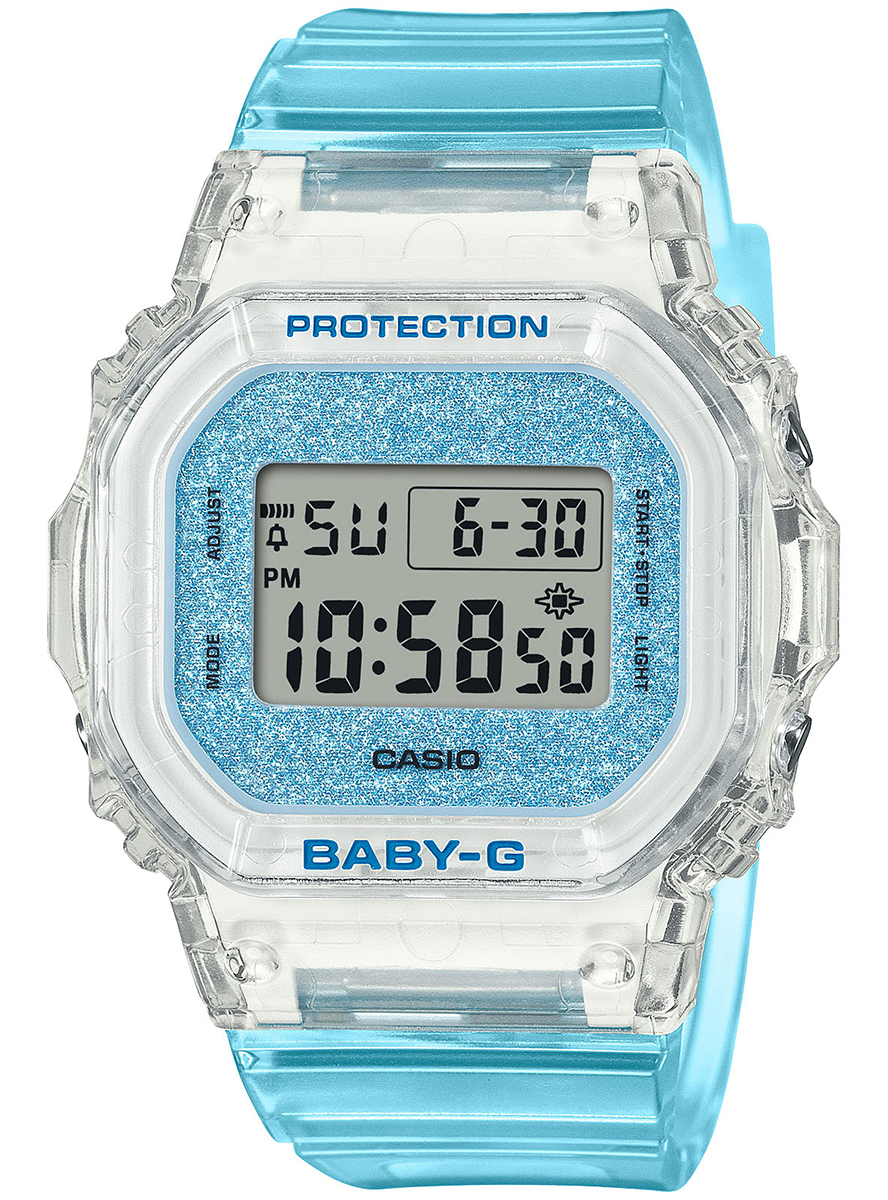 Koperta o szerokości 38 mm została wykonana z wytrzymałego tworzywa sztucznego w eleganckim, białym kolorze. Zegarek wyposażono w transparentny pasek, który nadaje całości lekkości i nowoczesnego charakteru, świetnie wpisując się w aktualne trendy. Solidna konstrukcja charakterystyczna dla serii BABY-G gwarantuje odporność na wstrząsy.
