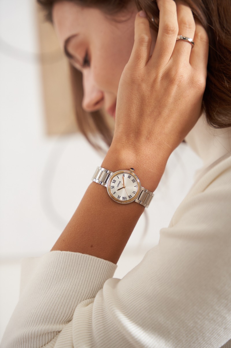 Lorus RG223YX9 to zegarek, który łączy klasyczną formę z nowoczesnym biżuteryjnym wykończeniem. Jego największym atutem jest dwukolorowa bransoleta – połączenie srebra i złota, które nadaje mu wyjątkowego charakteru i sprawia, że doskonale komponuje się zarówno z elegancką biżuterią, jak i codziennymi stylizacjami. Koperta o szerokości 23 mm, wykonana z wysokiej jakości stali szlachetnej, chroni minimalistyczną białą tarczę o eleganckim układzie indeksów. Wewnątrz pracuje precyzyjny mechanizm kwarcowy, gwarantujący dokładność pomiaru czasu. Mineralne szkło skutecznie zabezpiecza zegarek przed zarysowaniami, a wodoszczelność do 50 m zapewnia komfort noszenia w każdej sytuacji. Ten model to idealny wybór dla kobiet, które lubią subtelny luksus i ponadczasowy styl. Lorus RG223YX9 doskonale łączy funkcjonalność z elegancją — to zegarek, który podkreśli pewność siebie i doda klasy każdej stylizacji.