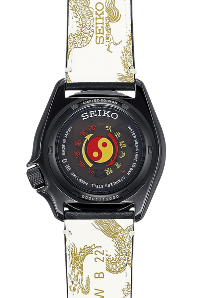 Półtransparentny dekiel zegarka Seiko 5 Sports Bruce Lee zawiera symbol Jeet Kune Do, oparty na symbolu jin i jang. Dodatkowo wygrawerowano napis „Limitowana Edycja” oraz numer seryjny zegarka.