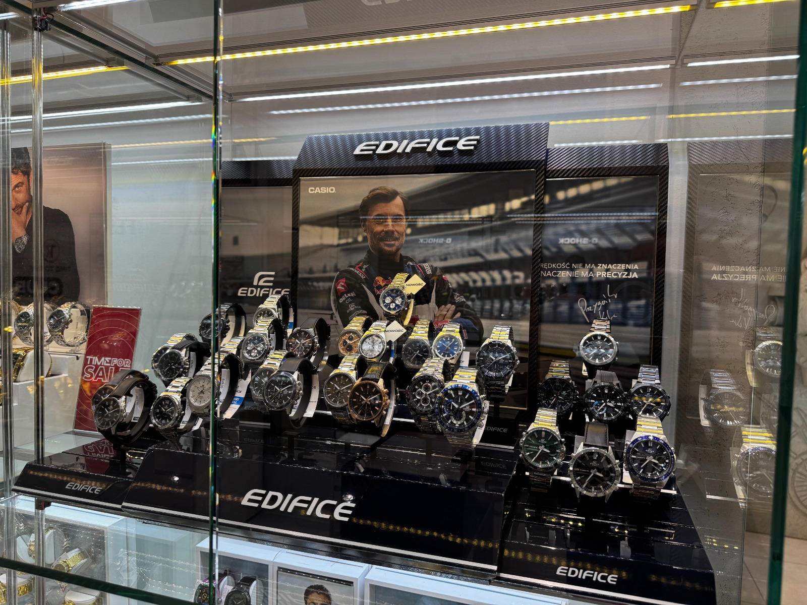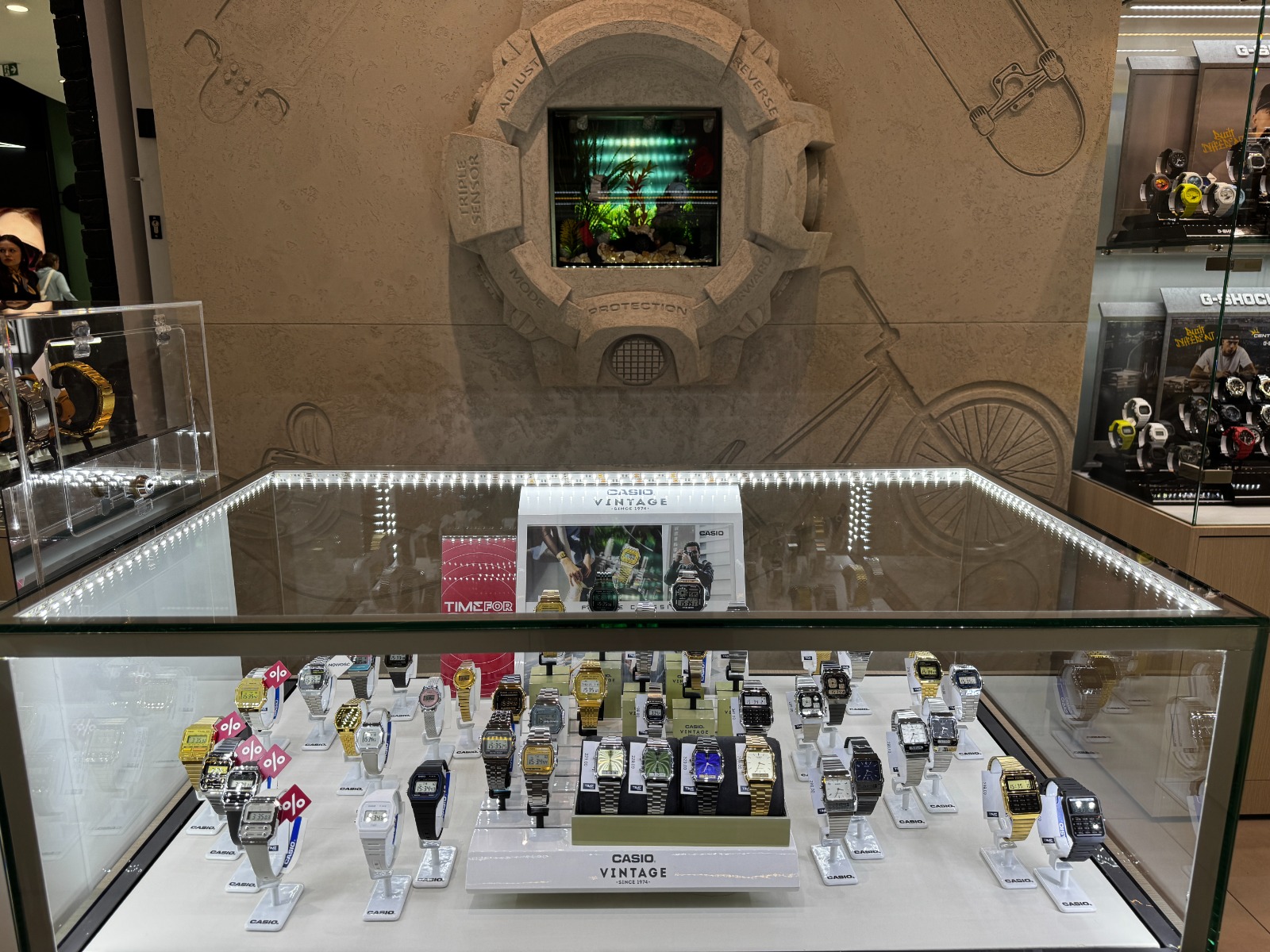 Już od progu uwagę przyciąga coś absolutnie wyjątkowego – "akwarium G-Shocka", którego nie znajdziesz w żadnym innym salonie w Polsce. To efektowna instalacja prezentująca niezniszczalne zegarki G-Shock zanurzone w glicerynie – przez całą dobę, przez 7 dni w tygodniu. Dzięki temu klienci mogą na własne oczy zobaczyć odporność G-Shocków na skrajne warunki, co czyni je jednymi z najbardziej wytrzymałych czasomierzy na rynku.