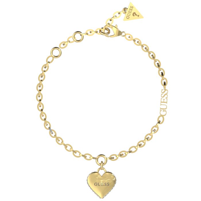 Damska bransoletka Guess Falling in Love JUBB02229JWYGS to elegancki i stylowy dodatek, który doda blasku każdej stylizacji. Wykonana z platerowanej stali szlachetnej w kolorze złotym, przyciąga wzrok swoim subtelnym urokiem. Na delikatnym łańcuszku znajduje się ozdobna zawieszka w kształcie serca, ozdobiona logo marki i błyszczącymi cyrkoniami, które podkreślają elegancki charakter biżuterii. Zapięcie na karabińczyk gwarantuje bezpieczeństwo noszenia, a długość 14,6 cm sprawia, że bransoletka jest idealna na każdą okazję.