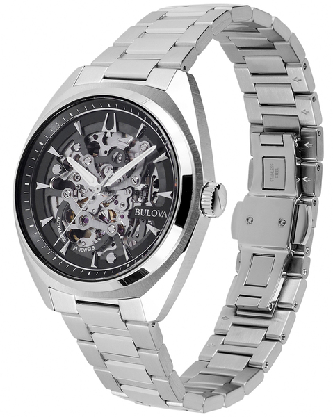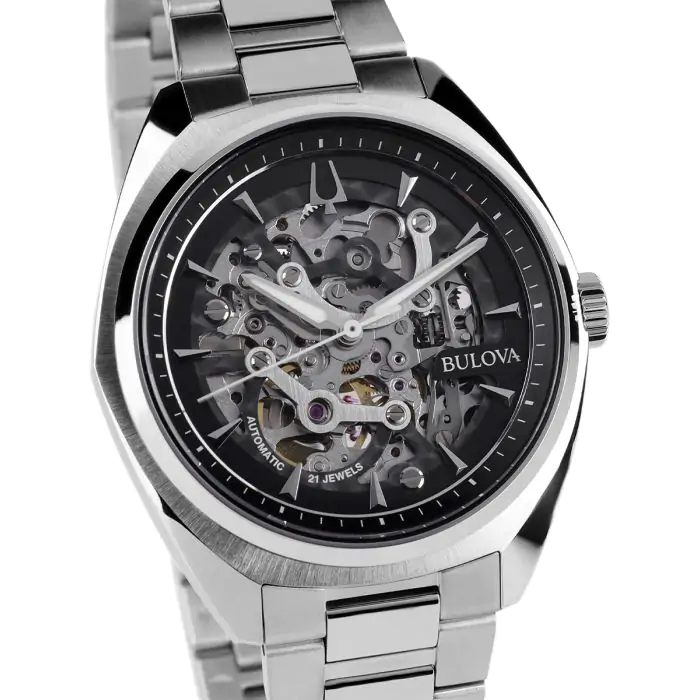 BULOVA 96A293 wyróżnia się wyjątkową tarczą typu skeleton, która odsłania wspaniały mechanizm zegarka.