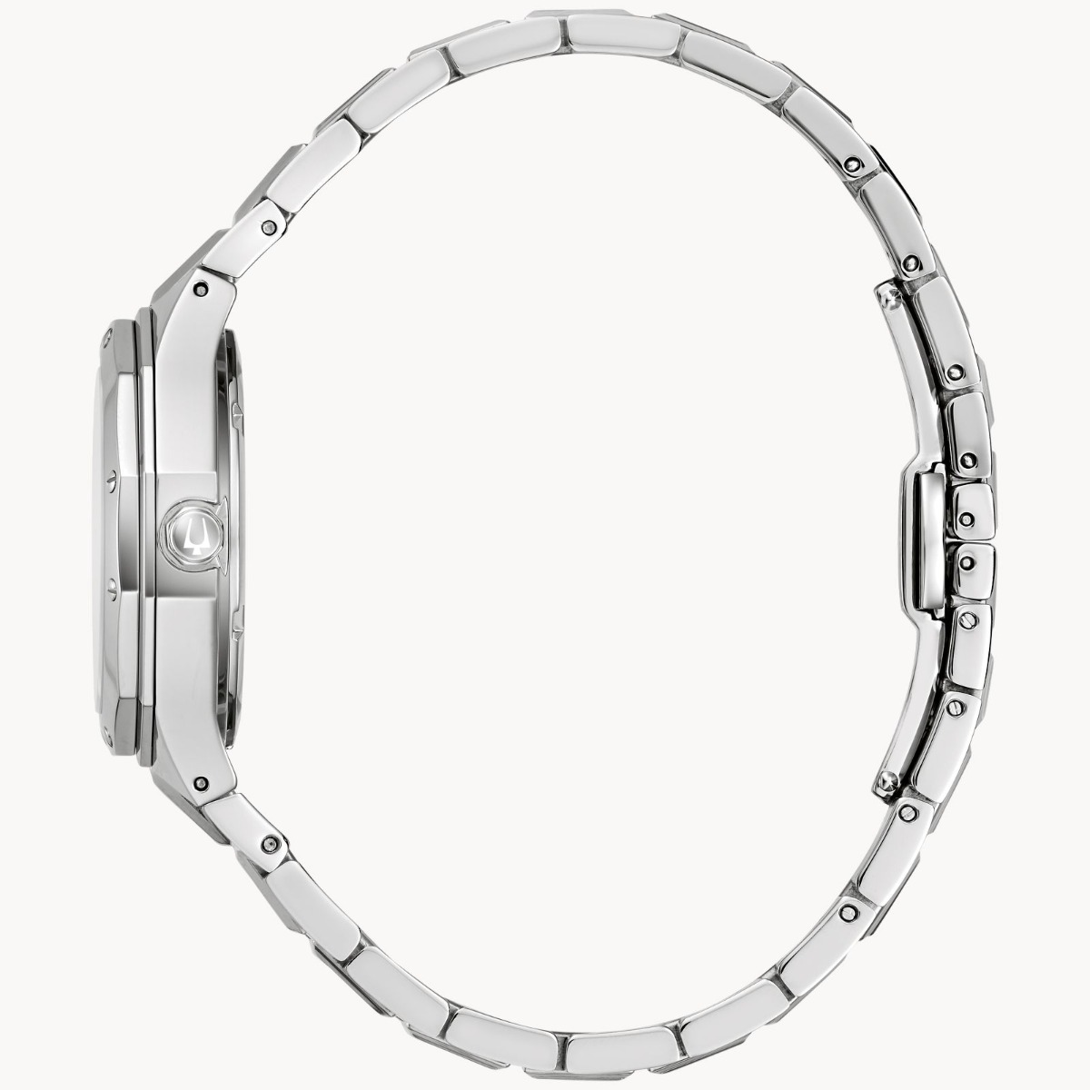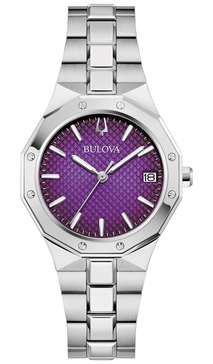 Śmiały, wyrafinowany design charakteryzuje ten klasyczny damski zegarek Bulova Prestige, łączący odważną estetykę z elegancją. Zegarek ma fasetowaną kopertę ze stali szlachetnej w srebrnym odcieniu o średnicy 32 mm, geometryczny bezel, płaskie szkło szafirowe z powłoką antyrefleksyjną, wodoodporność do 100 m oraz trójogniwową bransoletę z matowym i polerowanym wykończeniem i zapięciem motylkowym. Tarcza w odcieniach fioletu z gradientem ma wzór krzyżowy, srebrne wskazówki i indeksy z wypełnieniem Super-LumiNova oraz datownik. Zegarek, który olśniewa nowoczesnością i wyrafinowaniem - idealny towarzysz na każdy dzień.