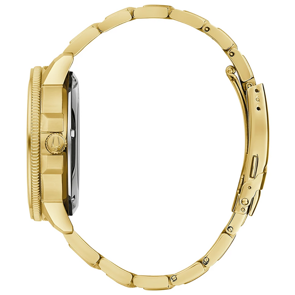 Koperta o średnicy 45 mm wykonana ze stali szlachetnej w kolorze złotym emanuje wyrafinowaniem i luksusem. Wodoszczelność na poziomie 200 metrów (20 bar) pozwala na swobodne korzystanie z zegarka zarówno na powierzchni, jak i pod wodą, idealnie nadając mu charakterystykę typu diver. Zakręcany dekiel oraz pierścień antyrewersyjny zapewniają ochronę mechanizmu i maksymalne bezpieczeństwo użytkowania.