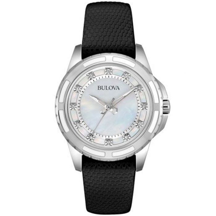 Elegancki zegarek damski Bulova Diamond 98S139, którego koperta o średnicy 32 mm została wykonana z wysokiej jakości stali szlachetnej, a czarny pasek to wyrób z naturalnej skóry. Perłowa tarcza została ozdobiona aż 12 prawdziwymi diamentami, które symbolizują indeksy godzin. Cyferblat jest chroniony przez szafirowe szkło odporne na zarysowania. Wodoszczelność 30 m chroni jedynie przed zachlapaniami.