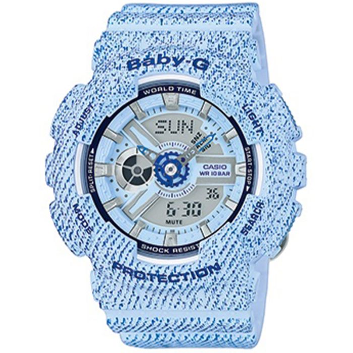CASIO Baby-G BA-110DC -2A3ER to damska odmiana popularnego, męskiego odpowiednika tej marki. Koperta o średnicy 43,5 mm oraz elastyczny pasek zostały wykonane z wysokiej jakości tworzywa w kolorze błękitu i granatu, co swoim wzorem przypomina tkaninę jeansową. Tarcza uzyskała podświetlenie diodą LED. Ten model posiada funkcję czasu światowego oraz automatyczny kalendarz, które doskonale sprawdzą się podczas międzynarodowych podróży. Funkcje stopera i timera przydadzą się podczas aktywności fizycznych, a 5 alarmów dziennych może służyć jako przypominacz lub budzik. Wodoszczelność 100m pozwala swobodny kontakt z wodą.