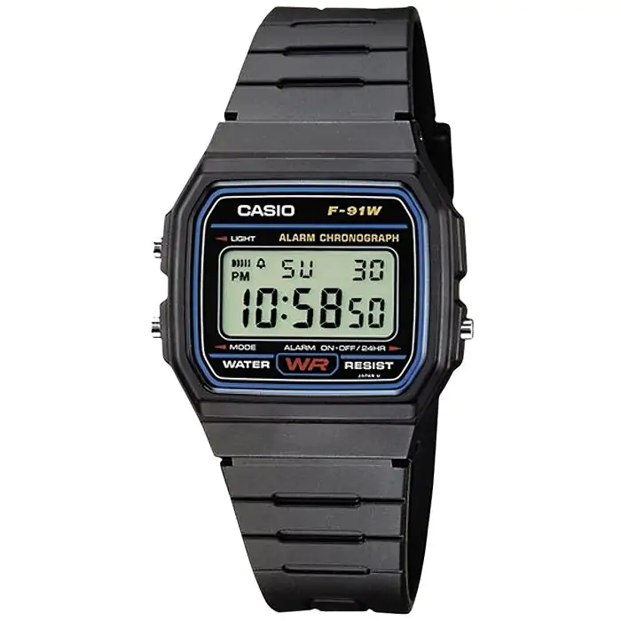 Casio Collection F-91W-1YER to ponadczasowy i niesamowicie popularny model, który posiada swoich fanów na całym świecie. Jest to wyjątkowo wytrzymała konstrukcja wykonana z tworzywa sztucznego. Zegarek posiada funkcje stopera, alarmu oraz automatycznego kalendarza. Odczyt w niekorzystnym oświetleniu ułatwi podświetlenie typu Microlight.