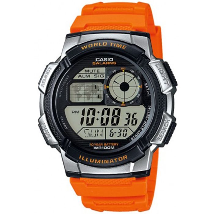 Sportowy zegarek dla mężczyzn CASIO AE-1000W -4BVEF posiada kopertę o średnicy 44 mm oraz elastyczny pasek, które zostały wykonane z wysokiej jakości tworzywa. Srebrna koperta zestawiona z jaskrawym pomarańczowym paskiem daje ciekawy, przyciągający uwagę rezultat. Jasny cyferblat tego modelu otrzymał podświetlenie diodą LED, która umożliwia odczytanie godziny w ciemności. Oprócz tego zegarek posiada funkcje takie jak czas światowy dzięki któremu można sprawdzić godzinę w największych miastach na świecie, 24 godzinny stoper i 60 minutowy timer, 5 alarmów dziennych oraz kalendarz automatyczny (jego zaletą jest pamięć krótszych miesięcy i lat przestępnych). Ogromnymi zaletami tego modelu jest czytelny wyświetlacz, bateria typu long life (przy standardowym użytkowaniu zegarka zapewnia pracę do 10 lat) oraz wysoka klasa wodoszczelności ( WR 100m), która pozwala na swobodne pływanie.