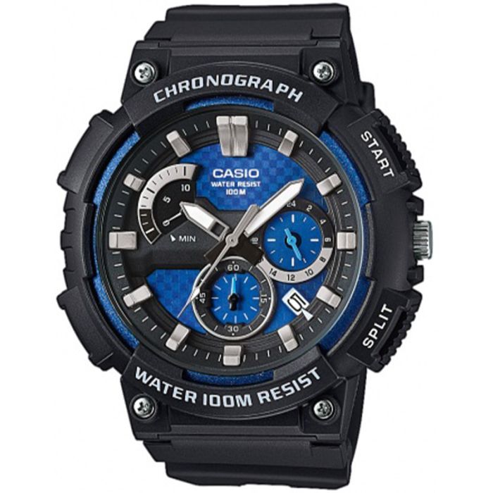 Męski Zegarek Casio MCW-200H -2AVEF to sportowa propozycja z męskiej kolekcji japońskiego producenta. Zegarek posiada kopertę o szerokości 53,5 mm i wysokości 14 mm oraz pasek wykonany z wysokiej jakości tworzywa. Analogowy cyferblat z ciekawym wzorem zdobią duże jasne indeksy i szerokie wskazówki pokryte warstwą luminescencyjną oraz trzy mniejsze tarcze. Jedna z tarcz wskazuje czas w trybie 24 godzinnym, natomiast pozostałe dwie obsługują 10 minutowy chronograf (stoper) odliczający z dokładnością do 1 s. Zegarek posiada klasyczny datownik wskazujący dzień miesiąca. Klasa wodoszczelności WR 100M.