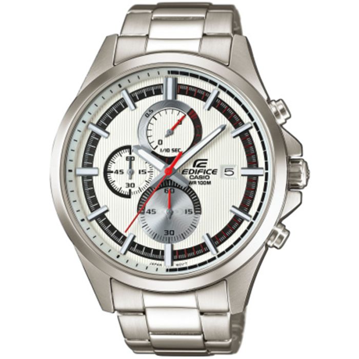 Zegarek męski Casio EFV-520D-7AVUEF ze sportowej kolekcji Edifice. Zegarek charakteryzuje się jasną tarczą w sportowym stylu retro z czarnymi i czerwonymi akcentami. Koperta o szerokości 47 mm i grubości 12,3 mm oraz bransoleta z pełnych ogniw zostały wykonane z wysokiej jakości stali nierdzewnej. Bezpieczne, składane zapięcie chroni przed przypadkowym rozpięciem na nadgarstku. Zegarek posiada niezawodny mechanizm kwarcowy z funkcją stopera oraz datownika. Stoper odmierza czas do 60 minut z dokładnością do 1/10s. Funkcja ta pozwoli na wykorzystanie zegarka podczas aktywności fizycznej. Natomiast datownik wskazuje dzień miesiąca. Indeksy oraz wskazówki z warstwą fluorescencyjną umożliwiają odczytanie godziny w ciemności. Klasa wodoszczelności 100m oraz zakręcany dekiel pozwalają na swobodne pływanie.