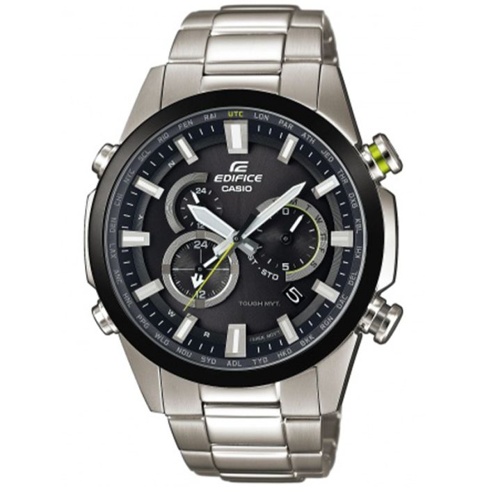 Casio Edifice EQW-T640DB-1AER to sportowy zegarek męski o minimalistycznym design'ie, który przyciąga uwagę. Zastosowanie zaawansowanej technologii umożliwia korzystanie z wielu ciekawych funkcji. Zegarek wskazuje dokładny czas dzięki synchronizacji falami radiowymi z zegarem atomowym. Zaś zasilanie energią słoneczną dostarcza niemal niewyczerpaną moc. Koperta o średnicy 44 oraz bransoleta z pełnych ogniw zostały wykonane z wysokiej jakości stali, która jest odporna na korozję. Czarny cyferblat posiada limonkowe akcenty, które nadają sportowego charakteru. Czarny pierścień dookoła cyferblatu powoduje dodatkowe powiększenie optyczne. Indeksy i wskazówki posiadają warstwą fluorescencyjną, która umożliwia odczytanie godziny w ciemności. Dodatkowymi funkcjami są czas światowy oraz 24 godzinny stoper z dokładnością do 1/20 s. Kalendarz automatyczny pamięta krótsze miesiące oraz lata przestępne. Wodoszczelność klasy 100m pozwala na swobodny kontakt z wodą np. podczas pływania.