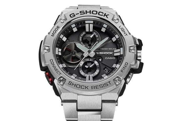 Wszystkie zegarki marki G-Shock gwarantują niebywałą wytrzymałość na różne warunki, ale te z serii G-Steel są w tym jeszcze lepsze, a przy tym bardzo stylowe. Wykonana ze stali nierdzewnej i tworzywa obudowa oraz system przeciwwstrząsowy chronią wnętrze zegarka, zapewniające jego nieprzerwaną pracę. Pełna detali tarcza i luminescencyjne wskazówki osłonięte są szkłem mineralnym odpornym na zarysowania. Klasa wodoszczelności WR 200 to ochrona przed ciśnieniami rzędu 20 barów, dzięki czemu w zegarku można bezpiecznie pływać. Dopełnieniem tych funkcji jest technologia Tough Solar, czyli zasilanie solarne, które sprawia, że zegarek nie zaskoczy nas nagłym wyczerpaniem baterii. By całość wyglądała gustownie i nosiła się komfortowo, zegarek wyposażono w pasek z tworzywa.