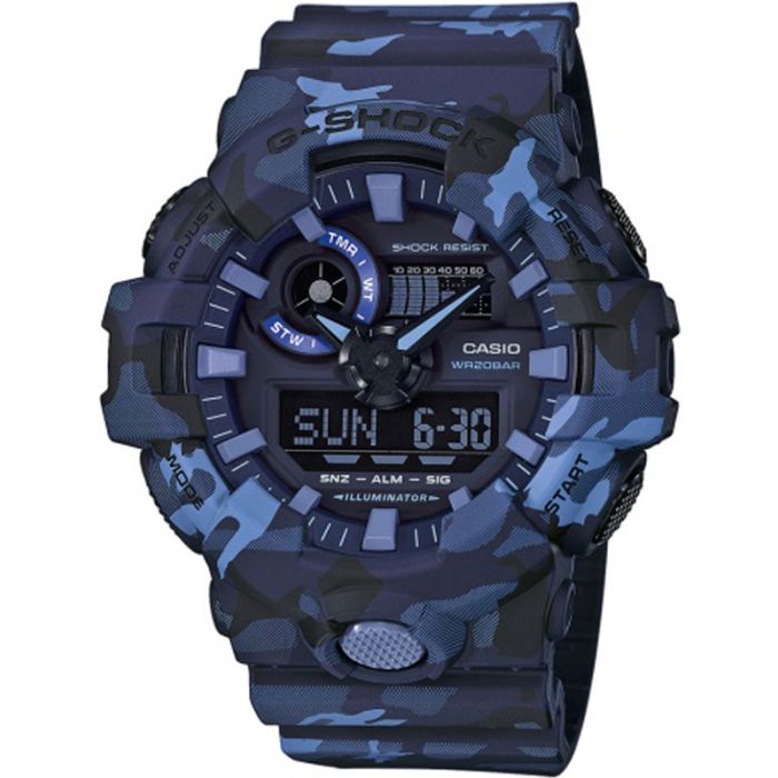 Zegarek męski Casio G-Shock GA-700CM-2AER charakteryzuje się unikalnym systemem wstrząsoodpornym, który został opracowany przez japońskiego producenta. Zegarek został wykonany z wysokiej jakości tworzywa, które zostało wykończone wzorem moro. Na cyferblacie znajdziemy cyfrowy wyświetlacz oraz analogowe wskazówki. Podświetlenie całej tarczy Super-Illuminator umożliwi odczytanie godziny nawet w największych ciemnościach. Oprócz tego w tym modelu znajdziemy takie funkcje jak czas światowy, 24 godzinny stoper oraz godzinny timer, 5 dziennych alarmów, automatyczny kalendarz i 24 godzinny tryb wyświetlania godziny oraz funkcję wyciszenia dźwięków. Funkcja ruchu wskazówki pozwala poprzez naciśnięcie przycisku odsunąć wskazówki i umożliwia dobre widzenie ekranów LCD. Klasa wodoszczelności WR 200m pozwala na swobodne pływanie oraz nurkowanie z akwalungiem.