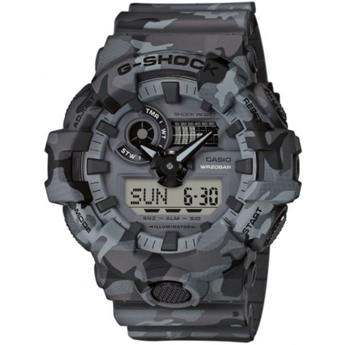 Zegarek męski Casio G-Shock GA-700CM-8AER charakteryzuje się unikalnym systemem wstrząsoodpornym, który został opracowany przez japońskiego producenta. Zegarek został wykonany z wysokiej jakości tworzywa, które zostało wykończone wzorem moro. Na cyferblacie znajdziemy cyfrowy wyświetlacz oraz analogowe wskazówki. Podświetlenie całej tarczy Super-Illuminator umożliwi odczytanie godziny nawet w największych ciemnościach. Oprócz tego w tym modelu znajdziemy takie funkcje jak czas światowy, 24 godzinny stoper oraz godzinny timer, 5 dziennych alarmów, automatyczny kalendarz i 24 godzinny tryb wyświetlania godziny oraz funkcję wyciszenia dźwięków. Funkcja ruchu wskazówki pozwala poprzez naciśnięcie przycisku odsunąć wskazówki i umożliwia dobre widzenie ekranów LCD. Klasa wodoszczelności WR 200m pozwala na swobodne pływanie oraz nurkowanie z akwalungiem.