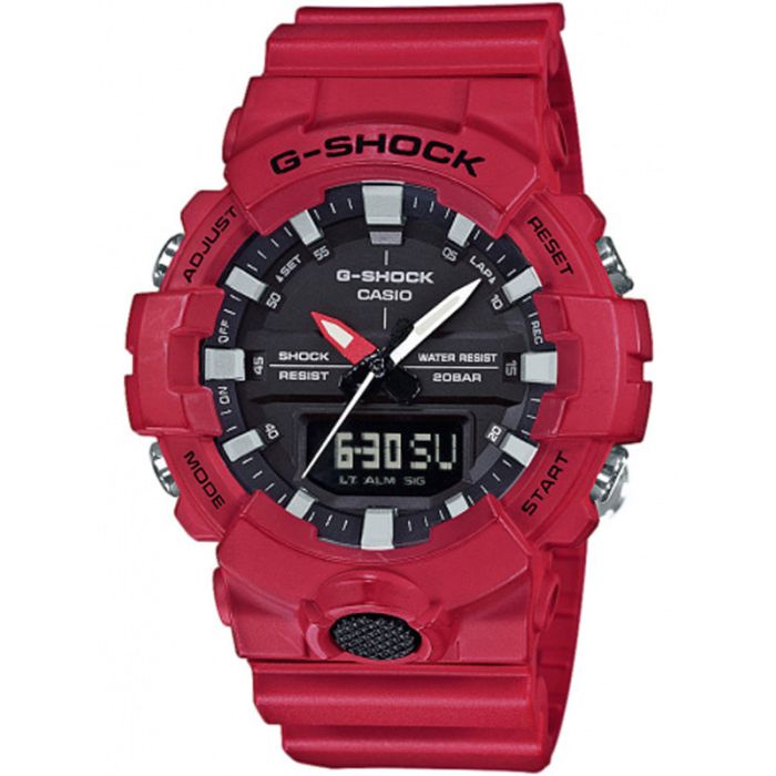 Zegarek męski Casio G-Shock GA-800 -4AER charakteryzuje się unikalnym systemem wstrząsoodpornym, który został opracowany przez japońskiego producenta. Zegarek został wykonany z wysokiej jakości tworzywa, które zostało wykończone matowym czerwonym kolorem.Na cyferblacie znajdziemy cyfrowy wyświetlacz oraz analogowe wskazówki. Podświetlenie całej tarczy Super-Illuminator umożliwi odczytanie godziny nawet w największych ciemnościach. Oprócz tego w tym modelu znajdziemy takie funkcje jak czas światowy, 24 godzinny stoper oraz godzinny timer, 5 dziennych alarmów, automatyczny kalendarz i 24 godzinny tryb wyświetlania godziny oraz funkcję wyciszenia dźwięków. Funkcja ruchu wskazówki pozwala poprzez naciśnięcie przycisku odsunąć wskazówki i umożliwia dobre widzenie ekranów LCD. Klasa wodoszczelności WR 200m pozwala na swobodne pływanie oraz nurkowanie z akwalungiem. Koperta zegarka mierzy 48 mm szerokości oraz 15 mm grubości.