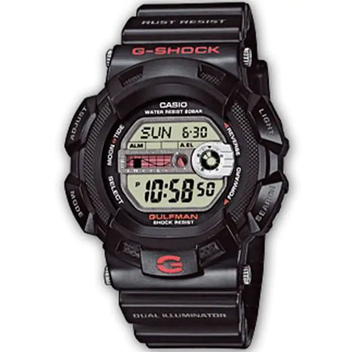 Zegarek Casio G-Shock G-9100-1ER charakteryzuje się unikalnym na cały świat systemem wstrząsoodpornym opracowanym przez japońskiego producenta. G-9100-1ER posiada kopertę oraz pasek wykonany z wysokiej jakości tworzyw w matowej czerni. Model ten posiada przydatne funkcje takie jak wskaźnik przypływów i odpływów oraz wskaźnik faz księżyca. Dodatkowe funkcje to podświetlenie Auto-Illuminator (automatyczne włączenie podświetlenia w słabych warunkach świetlnych), czas światowy, automatyczny kalendarz oraz możliwość wyświetlania godziny w formacie 12/24h, stoper i timer, 5 alarmów z funkcją drzemki, wyciszenie dźwięków. Zegarek charakteryzuje się wodoszczelnością klasy WR 200M, co pozwala na swobodne pływanie z zegarkiem na ręku.