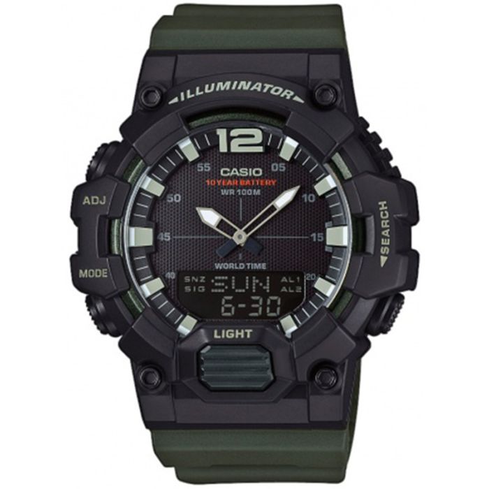 CASIO Sport HDC-700-3AVEF to sportowy zegarek dla aktywnych mężczyzn. Koperta oraz elastyczny pasek, zostały wykonane z wysokiej jakości tworzyw. Ciemny cyferblat tego modelu został wykończony wskazówkami i wyświetlaczem cyfrowym. Na tarczy umiejscowiono czytelne indeksy. Model ten został wyposażony w szereg funkcji: pamieć 30 numerów telefonicznych, czas światowy, stoper i timer, 3 alarmy dzienne z funkcją drzemki oraz kalendarz automatyczny. Ogromną zaletą modeli HDC-700 jest bateria typu long life (przy standardowym użytkowaniu zegarka zapewnia pracę do 10 lat) oraz podwyższony stopień wodoszczelności do klasy 100M, która pozwala na swobodne pływanie i zanurzanie się w wodzie.