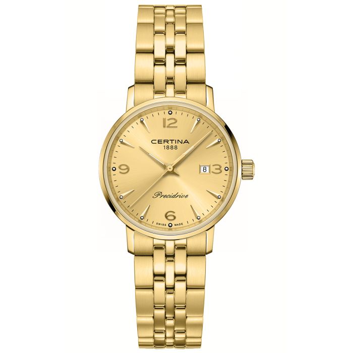 Zegarek CERTINA DS Caimano Lady charakteryzuje się solidną, okrągłą kopertą o średnicy 28 mm i grubości 7 mm, wykonaną z wysokiej jakości stali szlachetnej pokrytej trwałą powłoką PVD w eleganckim złotym kolorze. Koperta jest wodoszczelna do 100 metrów (10 bar), co sprawia, że zegarek jest odporny na zachlapania i pozwala na powierzchniowe pływanie. Złota bransoleta z regulacją obwodu wykonana jest również ze stali szlachetnej z powłoką PVD, co zapewnia odporność na zarysowania i korozję. Zapięcie motylkowe nie tylko ułatwia zakładanie, ale także zapewnia pewne trzymanie się na nadgarstku.