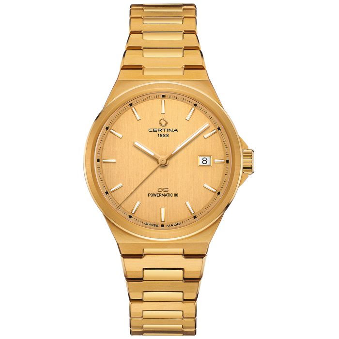 Tarcza zegarka Certina C043.407.33.361.00 w złotym kolorze przyciąga wzrok eleganckim, klasycznym stylem. Wyposażona jest w proste indeksy w formie słupków oraz smukłe wskazówki, które zostały pokryte powłoką Super-LumiNova®. Dzięki temu zegarek zapewnia doskonałą czytelność w każdych warunkach oświetleniowych. Datownik umieszczony na godzinie 3 precyzyjnie wskazuje dzień miesiąca, dodając funkcjonalności.