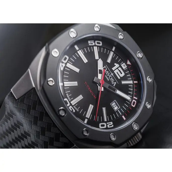 DAVOSA Titanium Automatic 161.561.55 to szwajcarski męski zegarek odznaczający się precyzją i wyjątkową funkcjonalnością. Klasyczna tarcza w czarnym kolorze, z delikatną teksturą guilloché, podkreśla elegancję oraz sportowych charakter czasomierza. Dzięki powłoce luminesacyjnej umieszczonej na białych indeksach oraz oryginalnych wskazówkach, zegarek zapewnia doskonałą czytelność również w ciemności. Dodatkowo czasomierz wyposażony jest w datownik dnia miesiąca znajdujący się na godzinie 3, co ułatwia śledzenie daty oraz jest szczególnie przydatne w codziennym użytkowaniu.