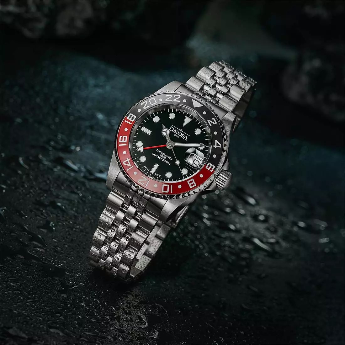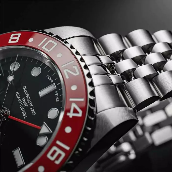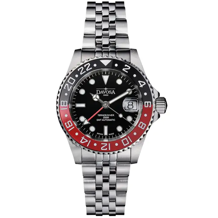 Davosa Ternos Ceramic GMT 161.590.09 to perfekcyjne połączenie funkcjonalności i estetyki. Dzięki powłoce luminesacyjnej na finezyjnych wskazówkach oraz srebrnych indeksach, czasomierz zapewnia doskonałą czytelność również w ciemności. Czerwone akcenty na czarnej tarczy podkreślają funkcję GMT i nadają sportowego charakteru zegarkowi. Dodatkowo czasomierz wyposażony jest w datownik dnia miesiąca znajdujący się na godzinie 3, co ułatwia śledzenie daty oraz jest szczególnie przydatne w codziennym użytkowaniu. Tarcza emanuje minimalistycznym luksusem, idealnym zarówno dla nurka, jak i miłośnika eleganckiego stylu życia.
