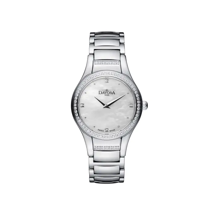 DAVOSA 168.573.15 Diva Lunastar to elegancki damski zegarek idealny na co dzień, jak i na wyjątkowe okazje. Koperta o wielkości 31mm ozdobiona kryształkami oraz bransoleta stworzone są z wysokiej jakości stali szlachetnej pokrytej powłoką PVD w kolorze srebrnym. Przepięknie mieniąca się perłowa tarcza ozdobiona srebrnymi minimalistycznymi indeksami i wskazówkami, pokryta jest niezwykle trwałym i odpornym na stłuczenia szkiełkiem mineralnym. Strategiczne indeksy na godzinie 3, 6, 9 i 12 zostały dodatkowo ozdobione kamieniami, dzięki czemu tarcza zyskuje jeszcze więcej szyku i polotu. Zegarek posiada wodoszczelność na poziomie 50m, co pozwala na lekki kontakt z wodą, na przykład prysznic. Czasomierz objęty jest dwuletnią gwarancją.
