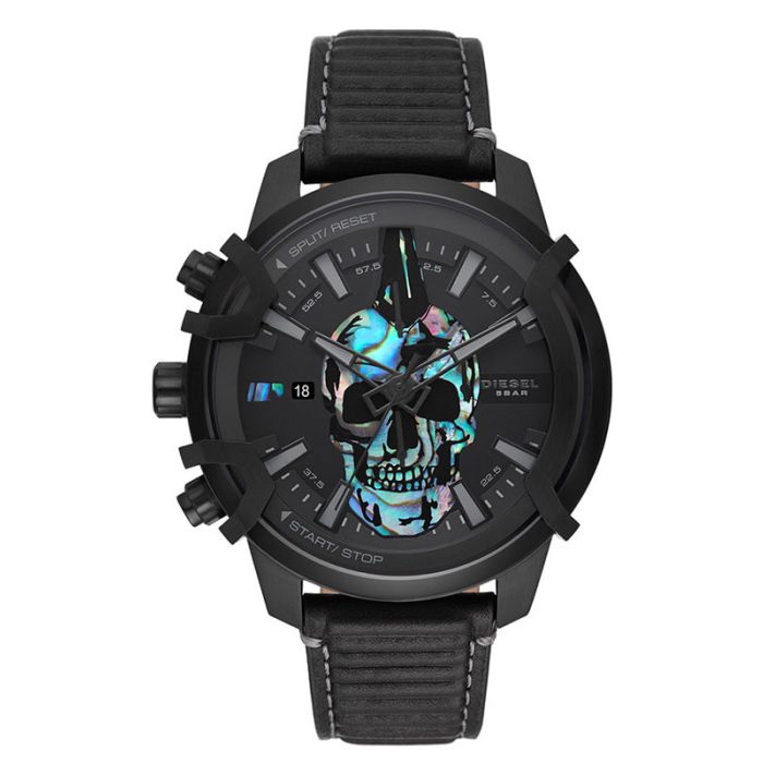DIESEL GRIFFED DZ4576 to model, który wyznacza nowe trendy w modzie. Koperta z przyciskami po lewej stronie została wykonana z wysokiej jakości stali szlachetnej, która charakteryzuje się wysoką odpornością na warunki atmosferyczne. Pokryto ją czarną powłoką PVD, co gwarantuje wysoką odporność oraz idealny kolor przez długie lata. W połączeniu z czarnym skórzanym paskiem tworzy spójną całość i świetnie dopasowuje się do nadgarstka. Na czarnej tarczy znajduje się chronograf (stoper) oraz datownik, który wskazuje aktualny dzień miesiąca. Całość przykryto wytrzymałym, wielokolorowym opalizującym szkłem mineralnym, które charakteryzuje się duża odpornością na stłuczenia. Model posiada precyzyjny mechanizm kwarcowy zasilany baterią. Wodoszczelność 50 M pozwala na swobodny kontakt z wodą.
