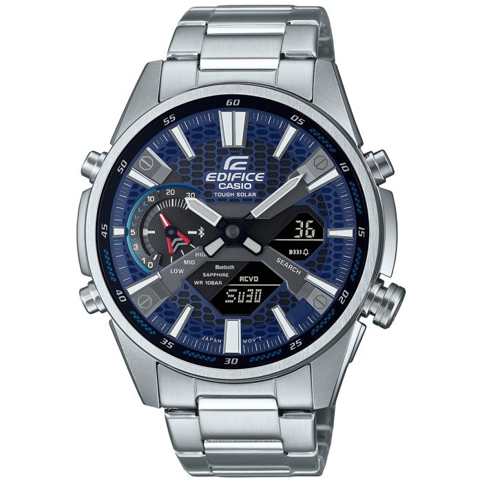 Casio ECB-S100D-2AEF to wysokowydajny czasomierz dedykowany do sportów motorowych, zaprojektowany i skonstruowany zgodnie z koncepcją „Szybkość i Inteligencja”. Zegarki z serii Edifice łączą w sobie wysoką jakość wykonania z najnowszą technologią. Wykończenie tego modelu ukazuje nam perfekcję w każdym calu oraz pasję z jaką został zaprojektowany przez japońskich projektantów, którzy postarali się zawrzeć w nim jak najwięcej wyjątkowych i wartych uwagi cech. Model ten projektowano z myślą o sporcie motorowym, dzięki czemu zegarek posiada niepowtarzalny, dynamiczny design. Kopertę wykonano z wysokiej jakości stali szlachetnej, która nie ulega korozji i połączono ją z klasyczną, stalową bransoletą. Cyferblat został wyposażony w dodatkowy cyfrowy wyświetlacz. Podświetlana przez Super Iluminator tarcza została oznaczona wyraźnymi indeksami dodatkowo pokrytymi warstwą Neobrite, co sprawia, że jest czytelna nawet w ciemnościach. Dodatkowym atutem jest technologia Bluetooth®. Za jej pomocą zegarek łączy się ze smartfonem, umożliwiając dostęp do wielu użytecznych opcji. Wśród nich jest funkcja synchronizacji czasu z czasem ustawionym w naszym urządzeniu, funkcja czasu światowego oraz tryb samolotowy. Na szczególną uwagę zasługuje funkcja zagubiony telefon, która pozwala użyć odpowiedniego przycisku w zegarku, aby ukryty przed naszym wzrokiem telefon wydał z siebie dźwięki. Model ten posiada automatyczny kalendarz, który ustawiony raz zawsze wskaże właściwą datę, bez względu na krótsze miesiące, 24-godzinny stoper, 24-godzinny timer, 5 niezależnych alarmów oraz wskazywanie godziny w formacie 12-/24-godzinnym. Tarczę zabezpiecza niezawodne i wysoce odporne na zarysowania szkło szafirowe. Czasomierz zasilany jest energią słoneczną. Wodoszczelność klasy 100M pozwala na swobodne pływanie i nurkowanie bez akwalungu.