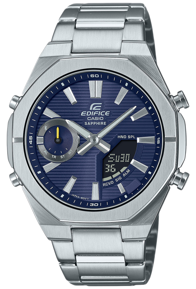 Zegarek posiada kopertę wykonaną z wysokiej jakości stali nierdzewnej, która w połączeniu ze stalową bransoletą tworzy solidną i elegancką całość. Wzornictwo zegarka podkreśla nowoczesny charakter serii Edifice, łącząc go z wyjątkowym komfortem noszenia oraz solidnością wykonania. Na tarczy znajduje się również wskaźnik naładowania baterii.